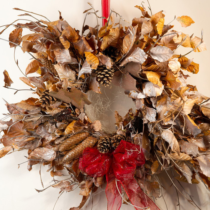 Create a beautiful seasonal fresh foliage wreath with traditional dried fruit, fir cones, cinnamon and all the usual trimmings for your front door at Christmas.